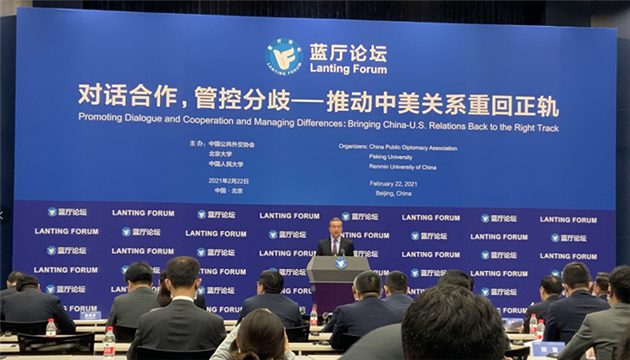 2月22日,王毅國務委員兼外長在「對話合作,管控分歧——推動中美關係重回正軌」藍廳論壇開幕式上致辭。