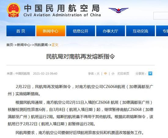 據民航局網站消息,2月22日,民航局再發熔斷指令,對南方航空公司CZ6068航班(加德滿都至廣州)實施熔斷措施。