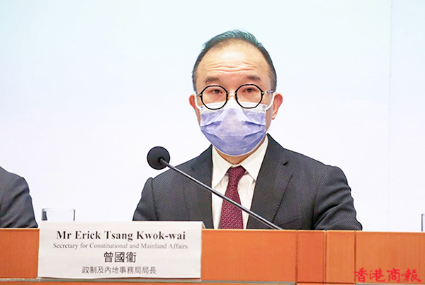 政制及內地事務局今日(23日)下午召開記者會,講解《2021年公職(參選及任職)(雜項修訂)條例草案》。條例草案建議除《基本法》104條下包含的公職人員之外,區議員都必須宣誓。政制及事務局局長曾國衞表示,是次修例進一步確立「愛國者治港」原則,將於本周五刊憲,3月17日提交立法會首讀及二讀,預料今年第二季完成三讀並通過。