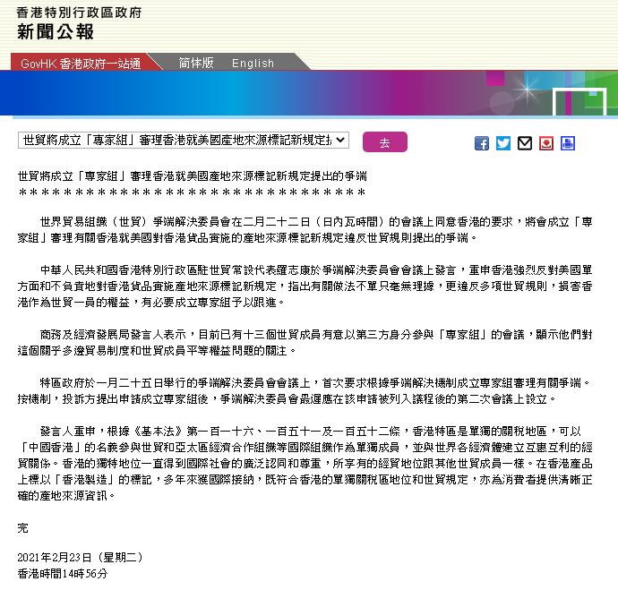 港府今日(23日)下午發布新聞公報表示,世界貿易組織(WTO)應香港要求,就美國規定香港生產的產品須標示為「中國製造」成立爭端解決小組。
