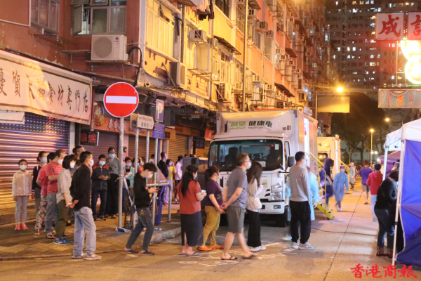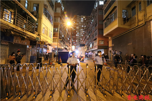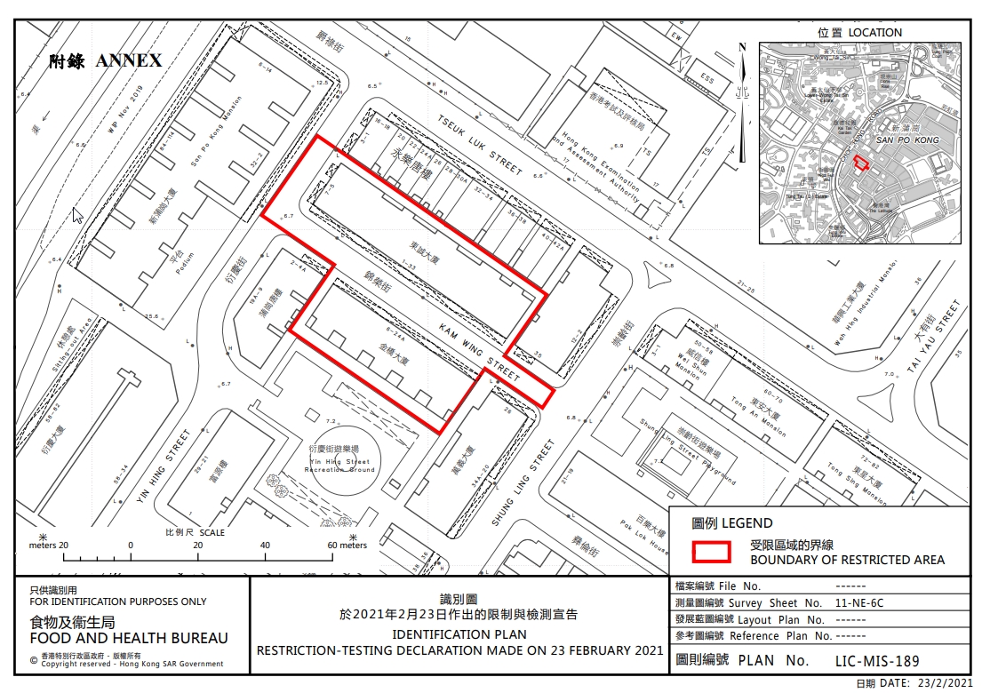 政府今日(23日)晚20:30分宣布引用《預防及控制疾病(對若干人士強制檢測)規例》(第599J章),作出限制與檢測宣告,自下午八時三十分起限制在新蒲崗錦榮街6-24A號金橋大廈和錦榮街1-33號及衍慶街5-7號東誠大廈內的人士須留在其處所並接受強制檢測。