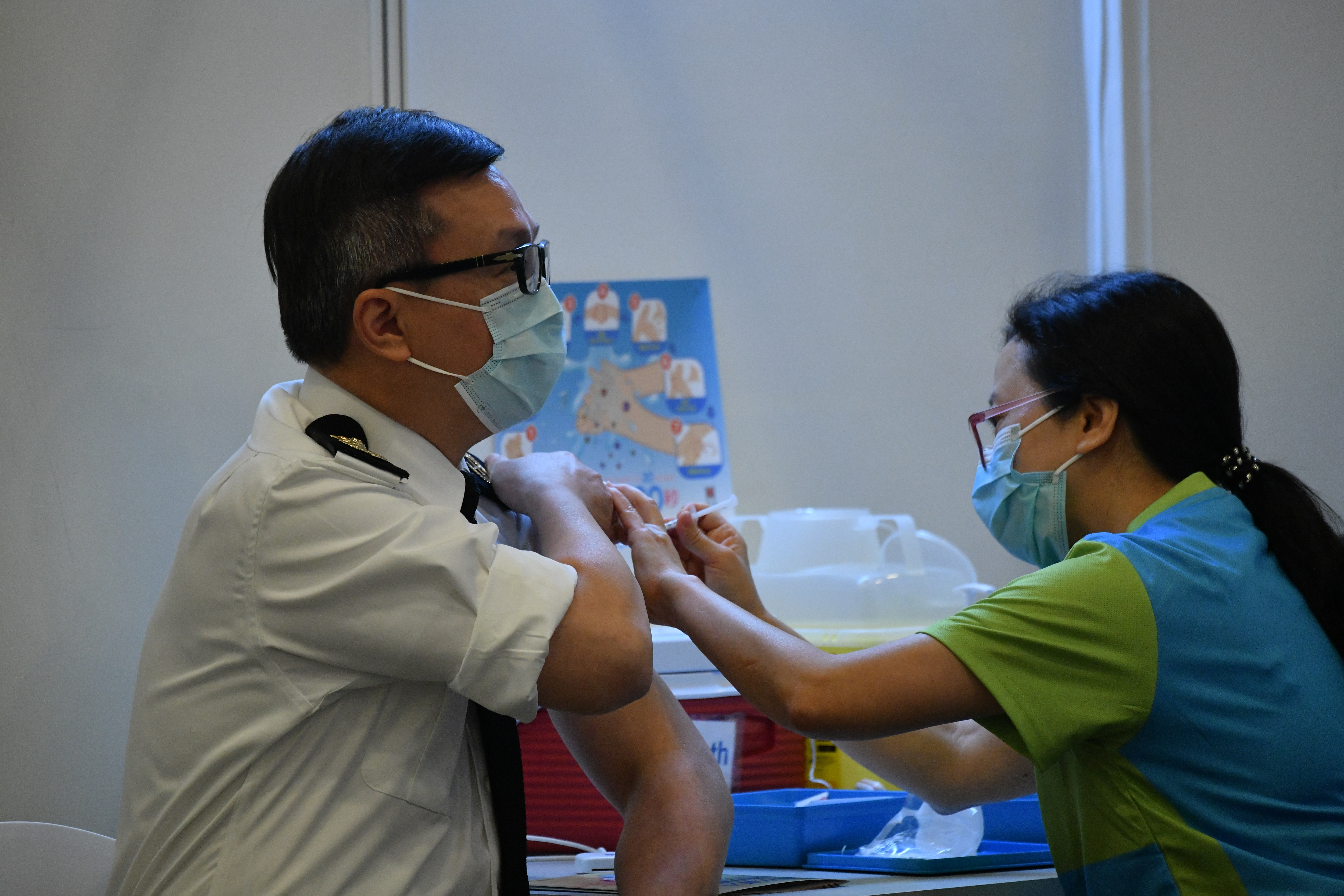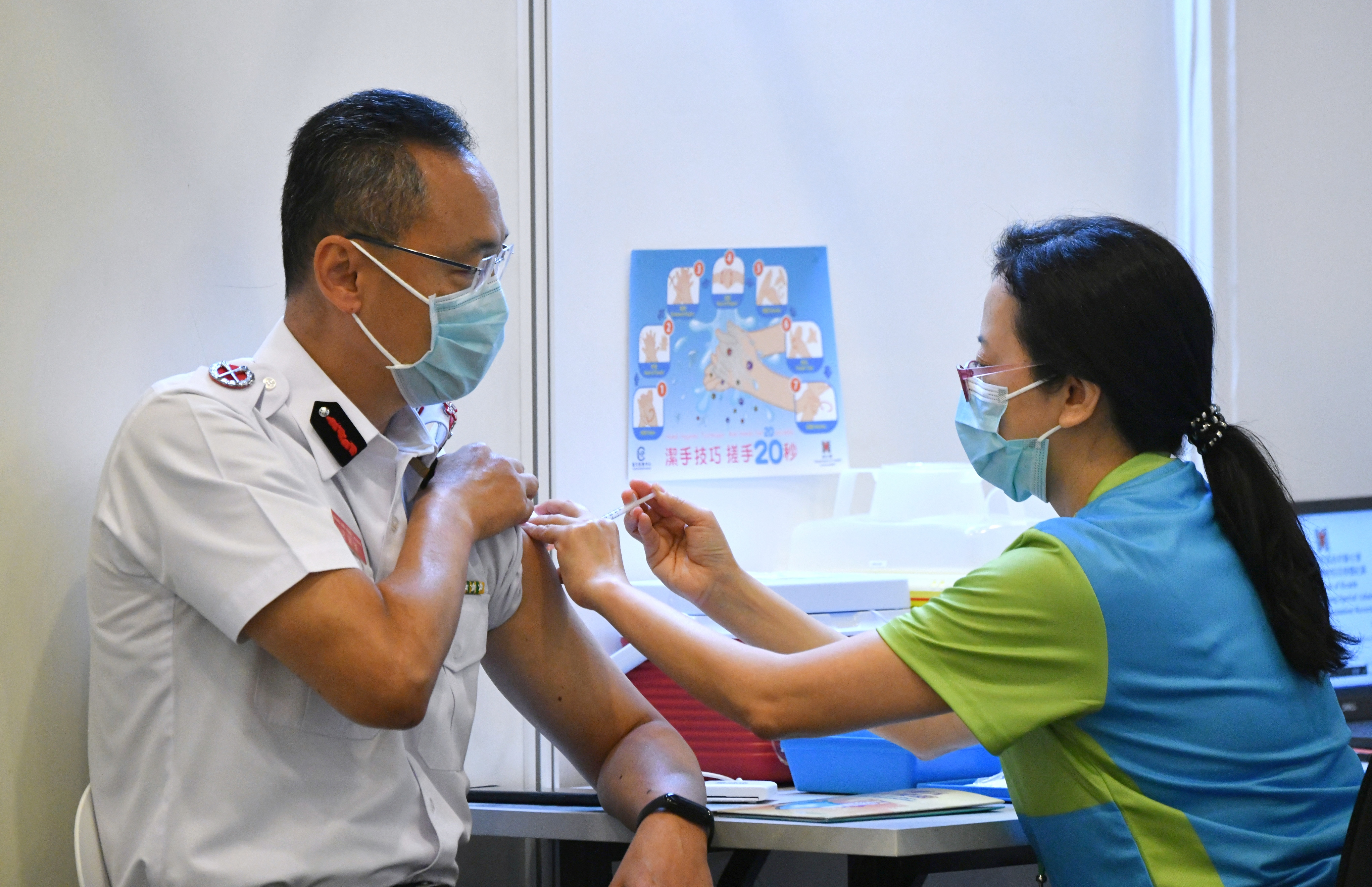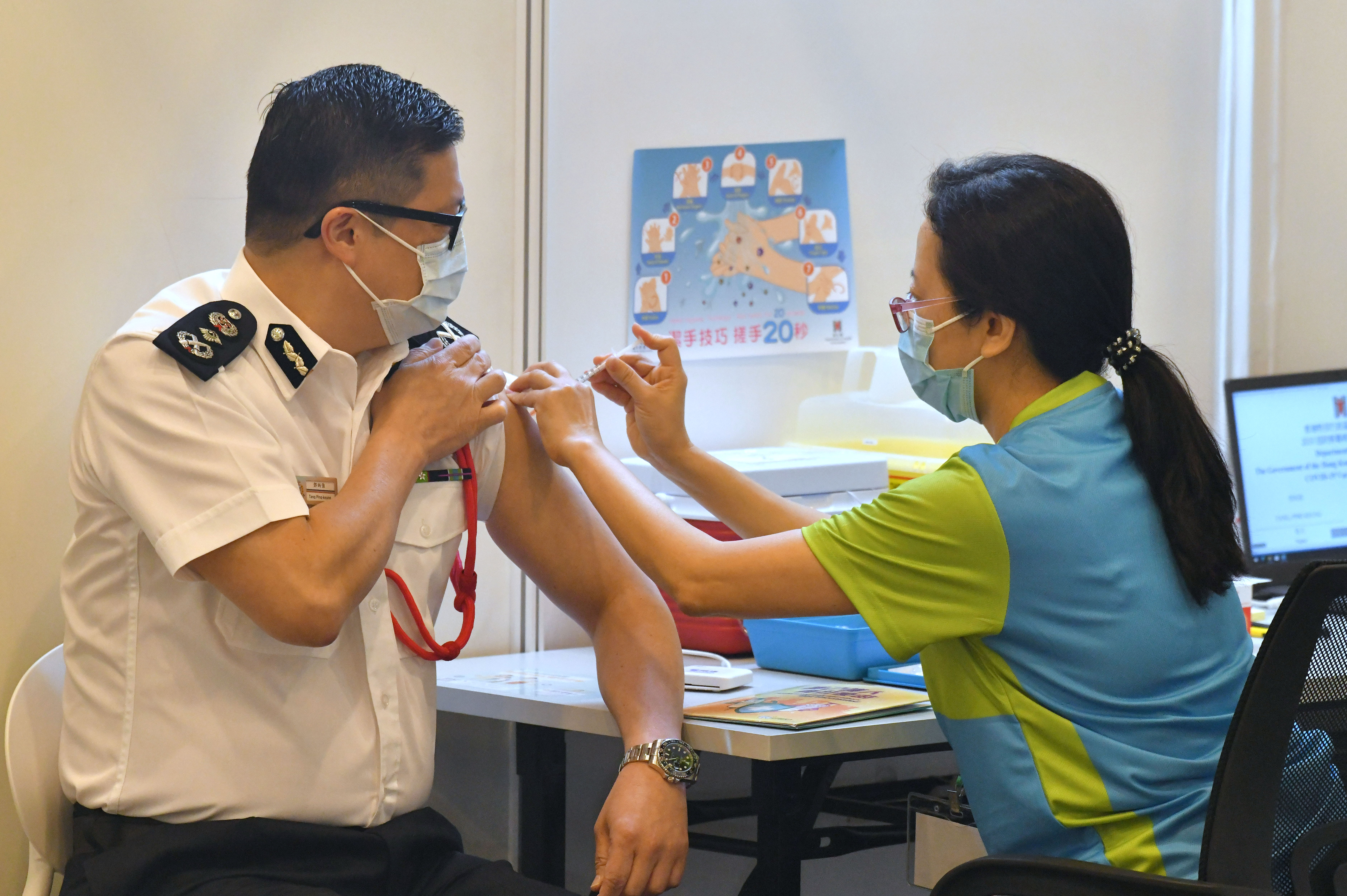 繼上午時段過百名醫護人員、安老院舍員工、機場工作人員及跨境貨車司機等人士接種後,來自警務處、海關、懲教署、消防處、入境事務處及政府飛行服務隊六個紀律部隊逾百名人員則在下午接種疫苗。警務處處長鄧炳強、海關關長鄧以海、懲教署署長胡英明、消防處處長梁偉雄、入境事務處處長區嘉宏及政府飛行服務隊總監胡偉雄機長在下午到場與同袍一同接種疫苗。