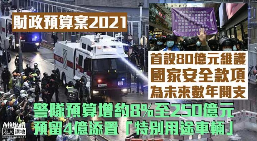 另外,警務處的最新開支預算約250億元,較20/21年度的修訂預算增加了約8%。在新一份預算案中,警隊用來添置設備的撥款上升至8.5億元,當中「特別用途車輛」的撥款由1.5億元大幅上升至4.1億元。警隊亦會更換6輛裝甲車。而警隊21/22年度的津貼開支則由約3億元,大幅上升至約14億元,增幅接近4倍。而警隊多個財政預算亦有所上升,當中以「維持社會治安」的預算開支最多,高達120億元。