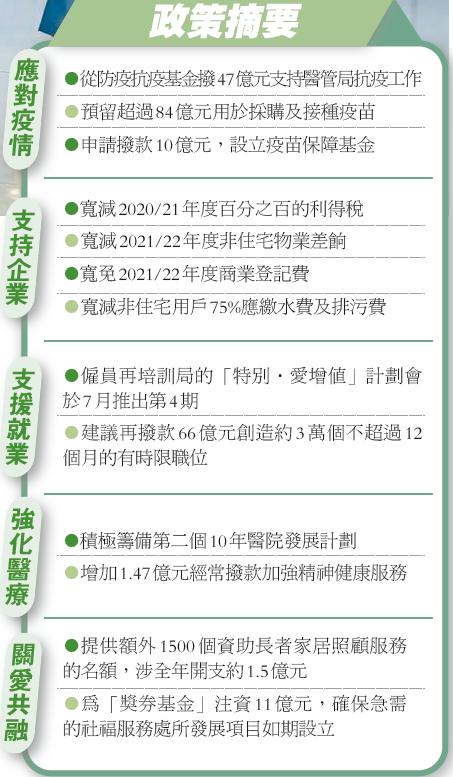 特區政府亦會寬減2021/22年度非住宅物業差餉,首兩季以每戶每季5000元為上限,其後兩季以每戶每季2000元為上限,估計涉及42萬個非住宅物業,政府收入將減少34億元。特區政府也寬免2021/22年度的商業登記費,讓150萬名業務經營者受惠,政府收入會減少30億元。