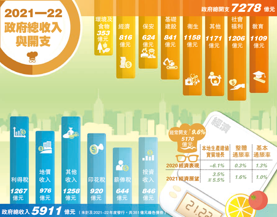 財政司司長陳茂波昨日表示,2021/22年度政府的總收入預計為5911億元,未計及發行綠色債券,過去財政年度赤字已逾2500多億元。他又指出,隨着世界多個地方相繼展開疫苗接種計劃,環球經濟有望在下半年起出現較明顯的改善,香港經濟今年可望恢復正增長,但復蘇進程將視乎疫情發展,預測今年經濟實質增長介乎3.5%至5.5%。
