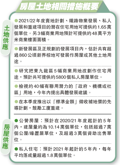 ○公營房屋:預計在2020/21年度起計的5年內,建屋量約為10.14萬個單位,包括超過7萬個公屋/綠置居單位,及超過3萬個資助出售單位。