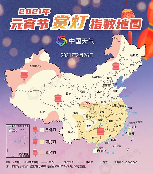 元宵節(2月26日)當天,中國北方大部降水稀少,適宜賞燈,吉林、遼寧、天津、北京、河北、山東、甘肅、青海等地大部地區天氣晴朗、雲量稀薄,可能看到「明月伴花燈」的景象;黑龍江西北部、內蒙古東北部、新疆北部、西藏南部以及陝西南部等地將有雪花飄落,可能欣賞到「正月十五雪打燈」的場景;安徽、江蘇、上海、浙江、江西、湖北、湖南、福建、台灣、廣東、廣西以及貴州西部等地將有降雨,可能出現「雨打燈」的景象。