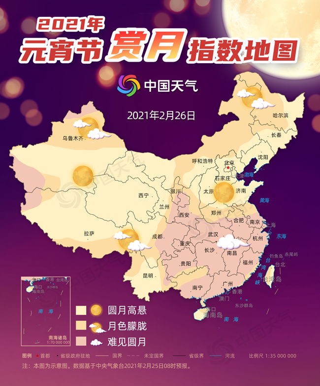 根據預報,元宵節(2月26日)當晚,吉林、遼寧、北京、天津、河北、山東、山西、青海、甘肅、雲南、海南以及新疆南部、西藏北部等地天氣晴朗,月明星稀,小夥伴們抬頭即可觀賞圓月;黑龍江、內蒙古西部、寧夏、河南等地的朋友可以看到「彩雲追月」的美景;而陝西南部、四川東部、廣西、廣東、福建、重慶、貴州、湖南、湖北、江西、浙江、上海、安徽中南部、江蘇中南部等地因為降水或雲層較厚,無緣明月。