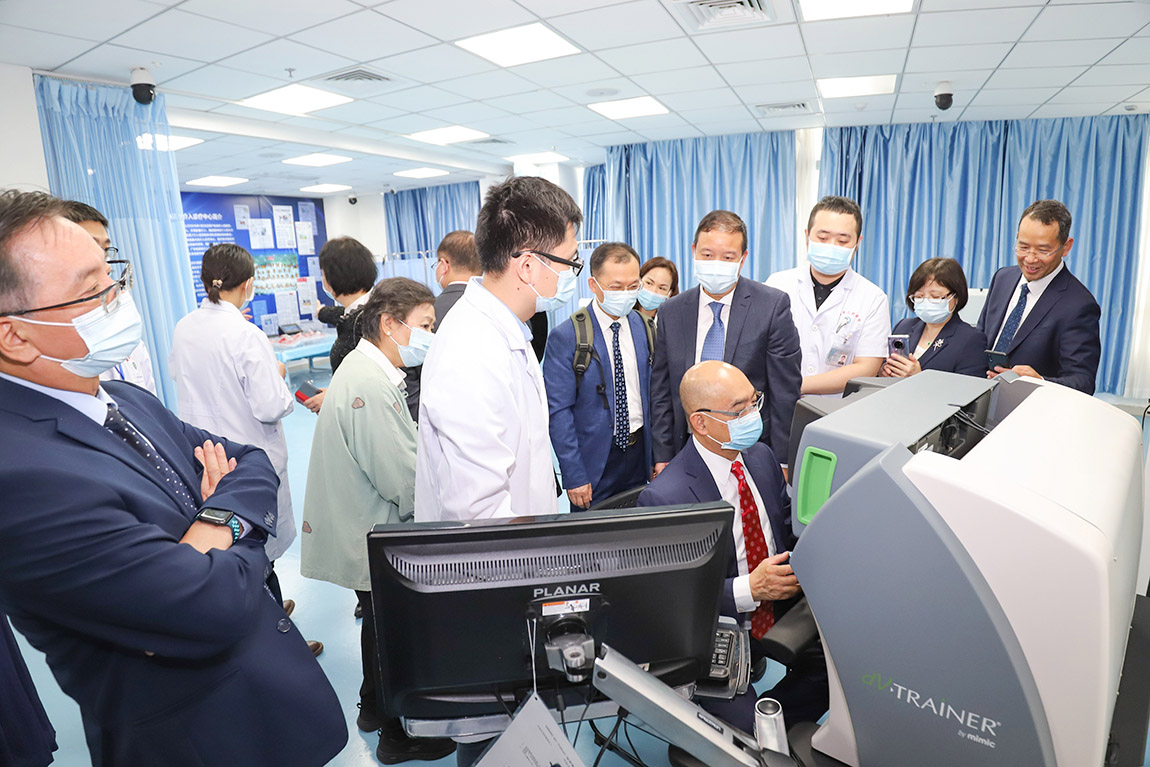 澳門鏡湖慈善會理事長劉永誠體驗達文西手術機械人教學系統。(程霖攝)