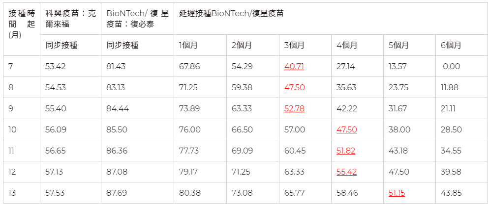 7-13個月同步接種或延遲接種科興疫苗與BioNTech/復星疫苗平均疫苗保護率比較之數據。