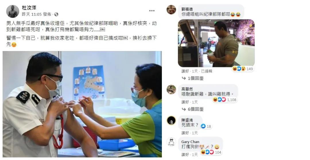 被網友戲稱為「黃絲之王」、「永遠的茄哩啡」的杜汶澤為拿政治「光環」近日亦跟風出嚟「抽水」,在fb貼出警隊「一哥」、警務處處長鄧炳強及多位男官員接種疫苗的相片,並以刻薄及惡毒留言話「男人無手瓜最好真系收埋佢,尤其系做紀律部隊嗰啲,真系好核突」(男人手臂沒肌肉最好收起來,特別是做紀律部隊的人,手臂細很難看),又語帶侮辱話「幼到斬雞都唔死咁,真系打飛機都驚唔夠力......」云云。