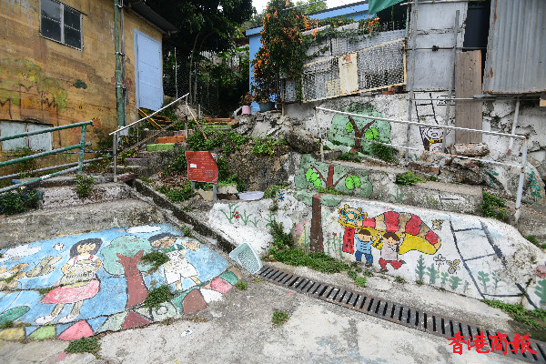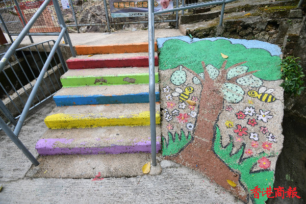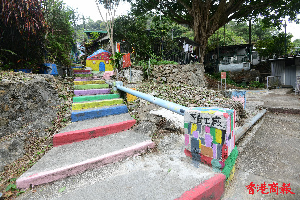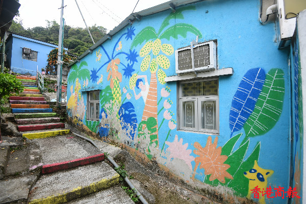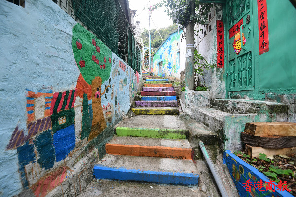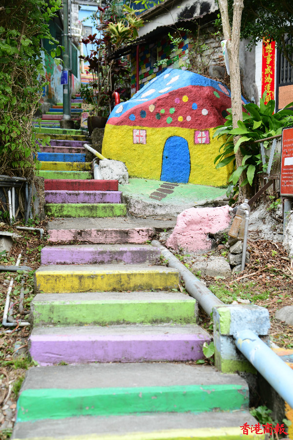 光板田村內現住有不少村民,經村民及藝術家合力活化這條村,在牆上劃上色彩繽紛的壁畫,當中連光板田村的特產大樹菠蘿,也化作壁畫圖案,村口地上更劃有兩隻可愛小豬歡迎村民回家一樣;走過村落的第一段,更有彩虹樓梯及彩虹磚牆。假日時更吸引不少人慕名而來,一睹壁畫村的特色,可感受到光板田村村民的齊心及溫暖,除種植多棵大樹菠蘿外,難得在鬧市中可找到一條隱世藝術村莊。(崔俊良 攝)