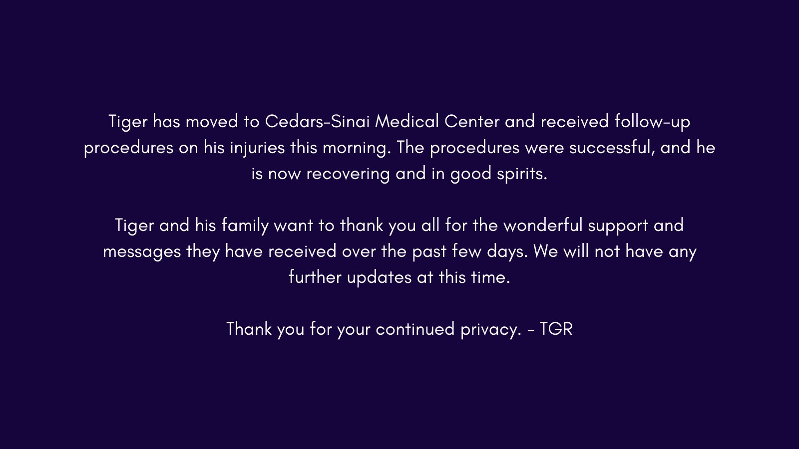 活士的Twitter帳戶發布的一條推文說,活士已轉到錫安山醫學中心,繼續車禍後的康復療程,並表示後續流程順利,活士目前狀態良好。推文亦感謝外界過去數天的支持。