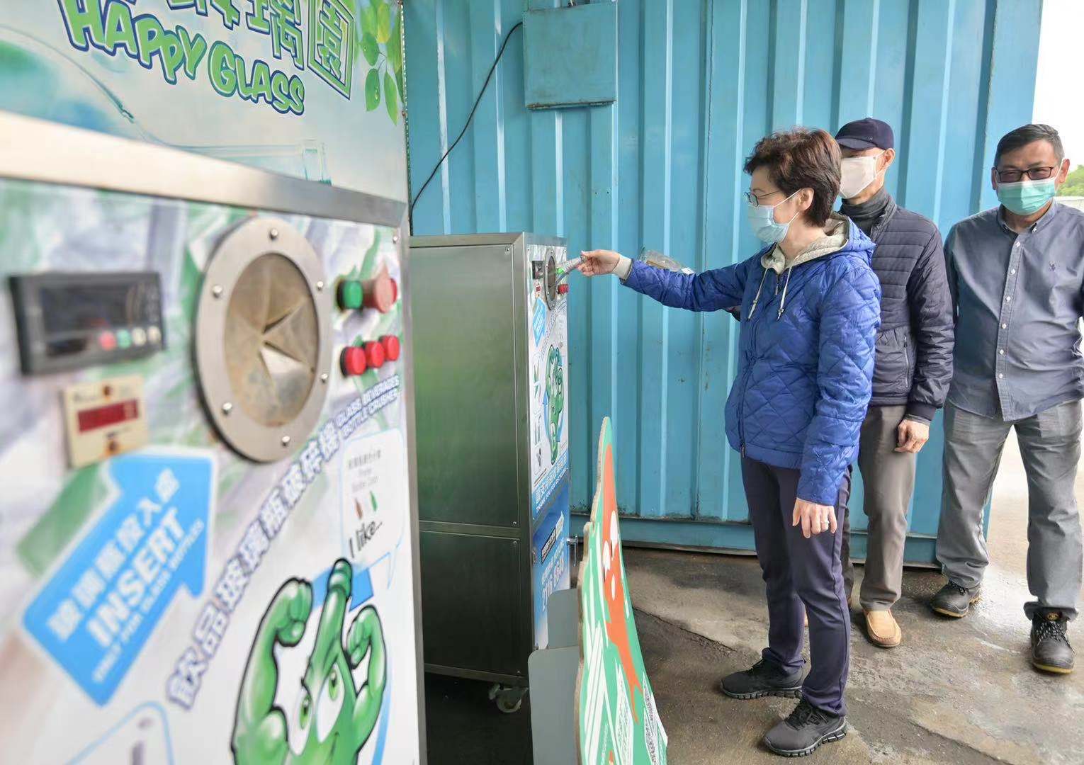 離開荔枝窩後,林鄭月娥在黃錦星的陪同下分別參觀環保署玻璃容器及塑膠回收服務承辦商的設施。為預備玻璃飲料容器生產者責任計劃的全面推行,環保署的玻璃管理承辦商自2018年初起在全港各區提供廢玻璃容器免費收集及處理服務。林鄭月娥到訪負責九龍區廢玻璃容器收集及處理服務的承辦商,獲悉在有關服務開展後,2018年廢玻璃容器的收集量超過13000公噸,較2017年相關的自願性回收計劃的收集量增加逾六成。而2019年的收集量約21000公噸,較2018年的收集量再增加接近六成。在全港設置的玻璃容器回收點亦有顯著增長,由2018年初有關服務開始時約2000個,倍增至現時約4000個。