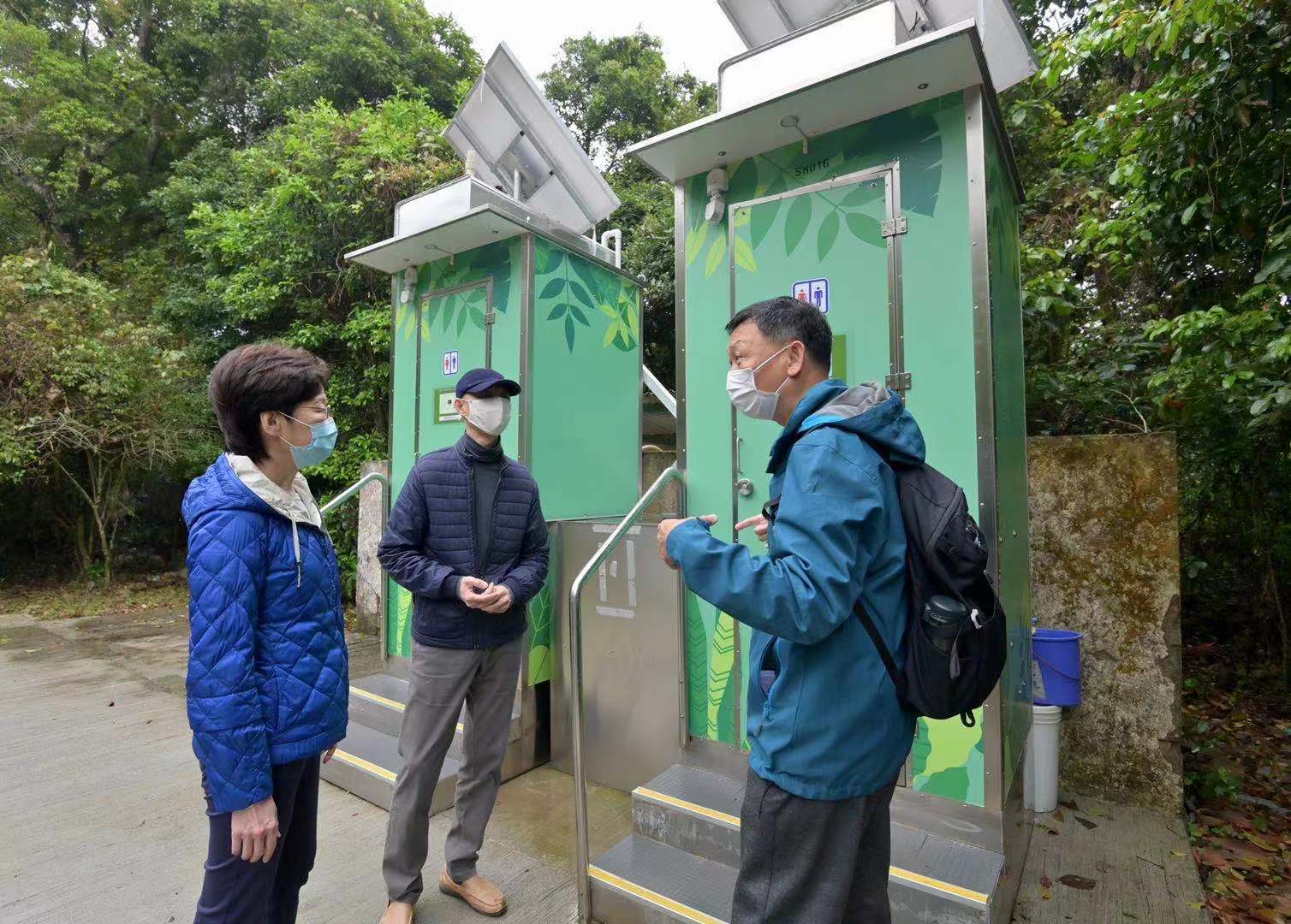 行政長官林鄭月娥今日(27日)早上前往荔枝窩,了解環境保護署轄下的鄉郊保育辦公室,在統籌保育鄉郊計劃及促進偏遠鄉郊的可持續發展方面的工作。她其後亦到訪多個環保署及其承辦商的回收設施。鄉郊辦於2018年成立,獲政府預留十億元支援有關保育偏遠鄉郊的工作,一半用作偏遠鄉郊小型改善工程,另一半透過鄉郊保育資助計劃支援非牟利機構推展偏遠鄉郊保育及活化工程。林鄭月娥及環境局局長黃錦星早上到訪荔枝窩,由鄉郊辦同事介紹在荔枝窩推行的小型改善工程。