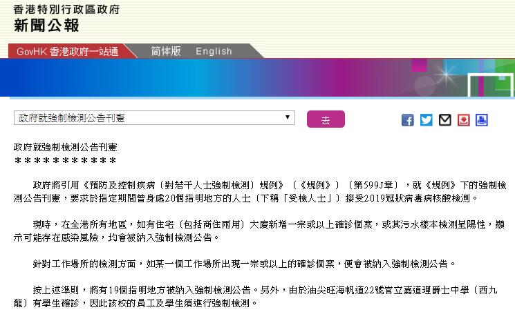 政府昨晚(2月28日)宣布將20個指明地方納入強制檢測公告,包括新增一宗或以上確診個案的14座大廈和5個工作場所,以及有學生確診的官立嘉道理爵士中學(西九龍)。