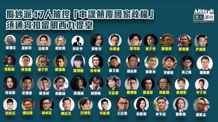 昨日(2月28日)下午12時,香港警方以「串謀顛覆國家政權罪」起訴47名人士,包括39男8女,年齡介乎23至64歲。所有上述人士會被通宵扣留,並將於今日(3月1日)上午於西九龍裁判法院提堂,各人早上陸續到法院準備應訊。