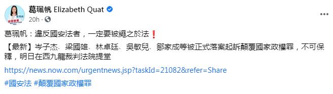 议员麦美娟亦在社交平台发文表示,搞初选真揽炒,支持依法審理,禍國亂港份子罪責難逃。