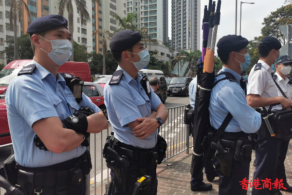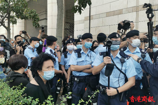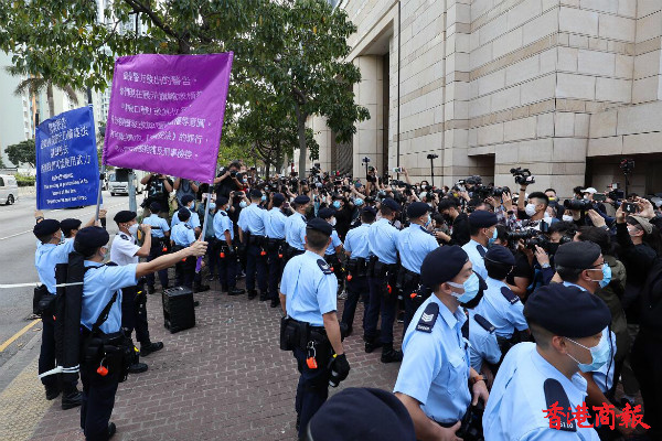 有黑衣人聚集在法庭之外,喧嚣试图施压法庭法官,有警員在場戒備。