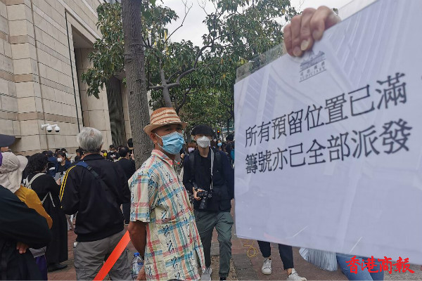工作人員拿出告示通知現場人士,预留位置已满,已經沒有辦法進法庭旁聽。休庭期間,有人繼續在現場排隊,席地吃飯。