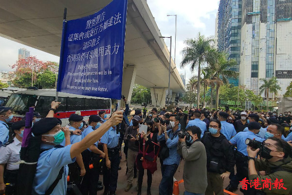 有網紅到場直播,場面一度混亂,警方出示藍旗及紫旗警告。(记者 木子 冯瀚文)