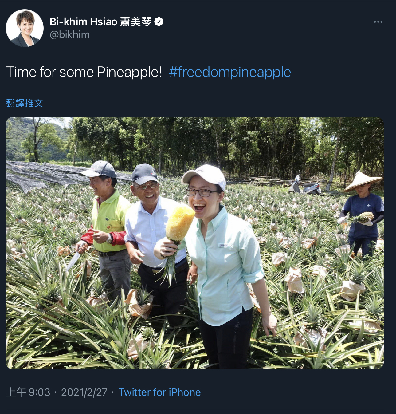 台「駐美代表」蕭美琴在社交媒體上曬出一張拿著整個菠蘿、張大嘴欲啃的作秀照片,「豪邁吃法」受到綠媒關注。蔡英文隨後也跑去蹭人氣,給蕭美琴留言稱:「要讓更多的美國朋友認識台灣鳳梨哦!」