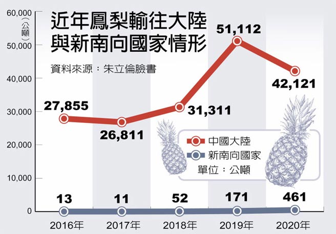國民黨前主席朱立倫近日用數據指出,2020年台灣鳳梨約外銷大陸數量,是新南向國家的100倍。蔡政府這些年來說的「推動新南向,避免過度依賴單一市場風險」根本就是騙人的大內宣,蔡政府欠果農一個道歉,更欠台灣人民一個說明。