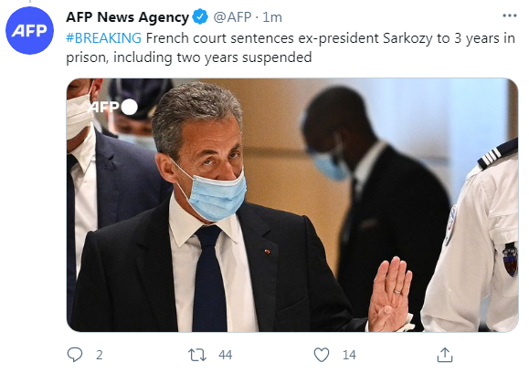 據法新社最新消息,法國法院以貪污罪判處前總統薩科齊有期徒刑3年,緩刑2年。