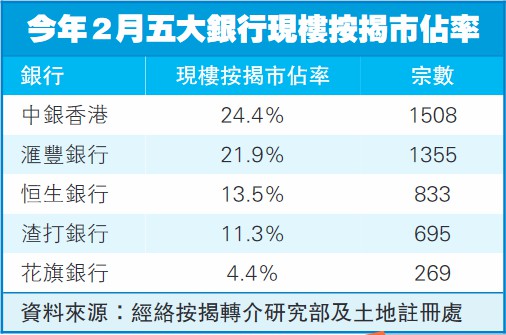 至於現樓銀行市佔率方面,中銀香港(2388)連續9個月蟬聯冠軍,市佔率達到24.4%;滙豐銀行則以市佔率21.9%排名第二位;而恒生銀行(011)以市佔率達13.5%排名第三。
