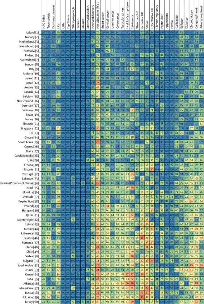 2019全球醫療質量和可及性榜單 (圖源:《柳葉刀》)