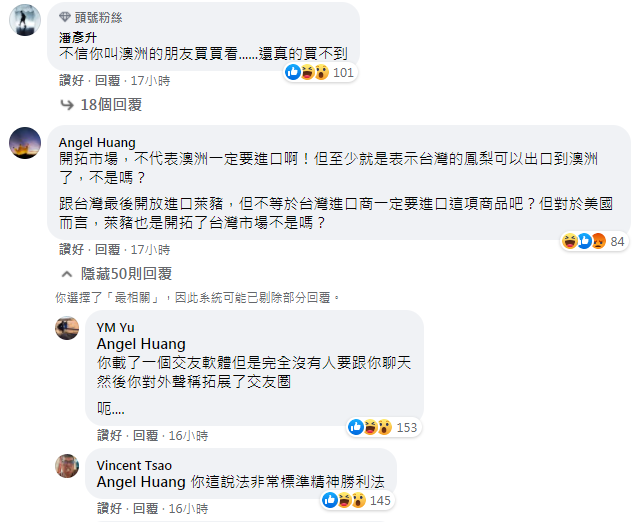 還有一名台灣網友試圖為蔡英文辯解,稱「開拓市場,不代表澳洲一定要進口啊!但至少就是表示台灣的鳳梨可以出口到澳洲了,不是嗎?」遭到不少網友反對,有人回覆指,「你載了一個交友軟件但是完全沒有人要跟你聊天,然後你對外聲稱拓展了交友圈」、「你這說法非常標準精神勝利法」……