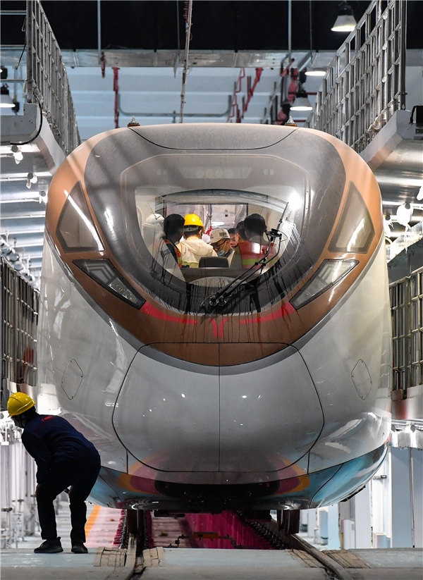 3月2日,技術人員對廣州地鐵18號線時速160公里電客車進行設備檢查。