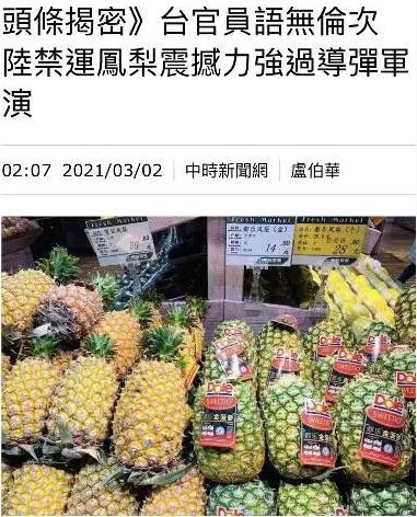 近日,大陸宣布禁止輸入台灣菠蘿(鳳梨)一事,令島內各界慌了神。台灣「中時新聞網」2日則刊文評論到:大陸禁了台灣菠蘿,小小一個水果就讓全台上下包括政府與民間都陷入一片慌亂。從台當局官員政客、台農業專家、綠媒名嘴等人,突然變得眾口喧譁,卻又完全語無倫次。