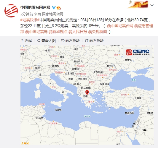 中國地震台網正式測定:03月03日18時16分在希臘(北緯39.74度,東經22.11度)發生6.2級地震,震源深度10千米。