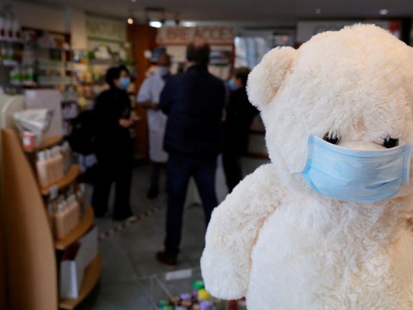 當地時間2月25日,新冠大流行期間,法國一家藥店擺設戴有口罩的大型公仔,提醒人們採取防護措施。