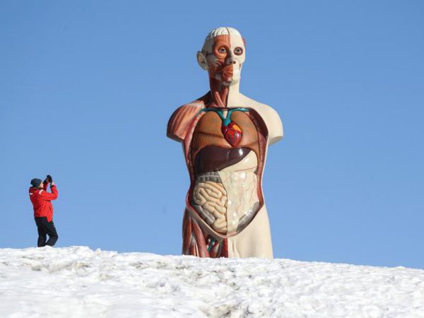 當地時間2月25日,在瑞士阿爾卑斯山度假勝地聖莫里茨,一位遊客在拍攝英國藝術家赫斯特2008年創作的名為「聖殿」的彩繪銅雕塑。