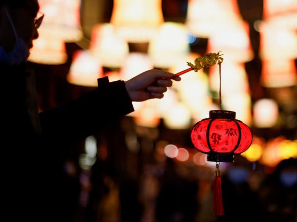 當地時間2月26日,在中國上海,一名男子手持紅燈籠慶祝元宵佳節。
