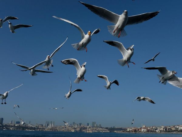 當地時間2月26日,在土耳其伊斯坦布爾,海鷗追隨客運渡輪展翅飛翔。