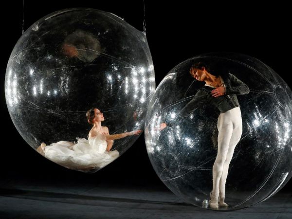 當地時間2月26日,德國斯圖加特芭蕾舞團舞者Elisa Badenes和Friedemann Vogel參與概念藝術家Florian Mehnert與反映社交距離有關的表演。