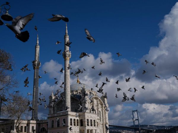 當地時間2月28日,土耳其伊斯坦布爾奧爾塔柯伊廣場在因防止冠狀病毒傳播而實施的全國性周末宵禁期間空無一人,只有成群的鴿子飛過。