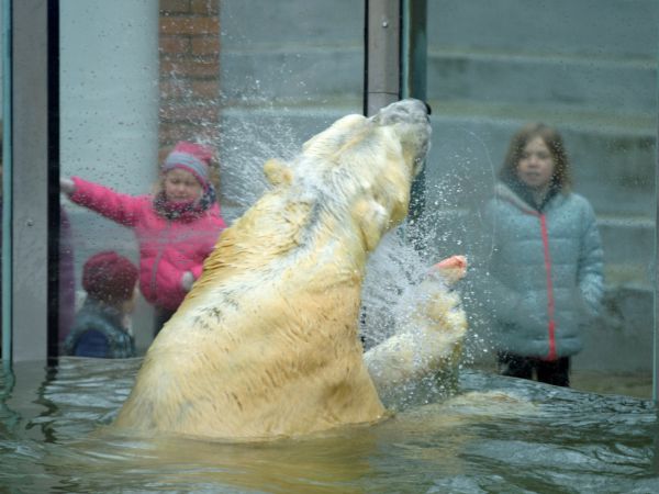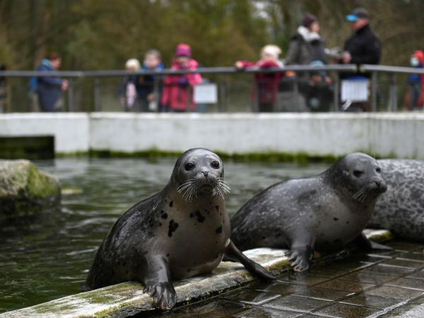 當地時間3月1日,在德國新明斯特,因新冠疫情被關停了幾個月的動物園重新營業後,人們入園觀賞動物。北極熊在水中嬉戲,海豹慵懶地爬出水面。