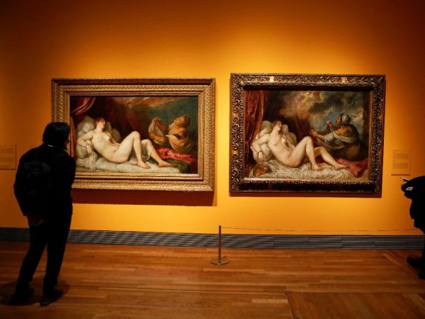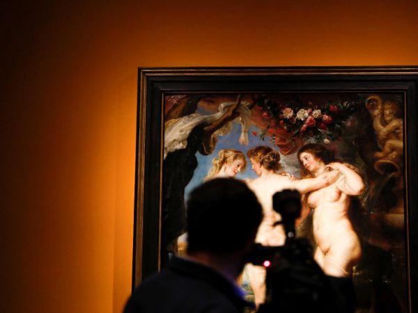 當地時間 3月1日,觀眾在西班牙馬德里普拉多博物館 「神話激情」展覽的媒體推介會上觀看畫家魯本斯的名畫《三美神》等藝術畫作。