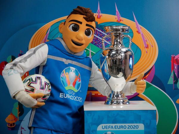 當地時間 3月3日,在俄羅斯聖彼德堡, 2020年歐洲杯吉祥物Skillzy與獎杯合影,開啟2020年歐洲杯足球賽100日倒計時。受疫情影響,原定於2020年進行的比賽將推遲到2021年進行。