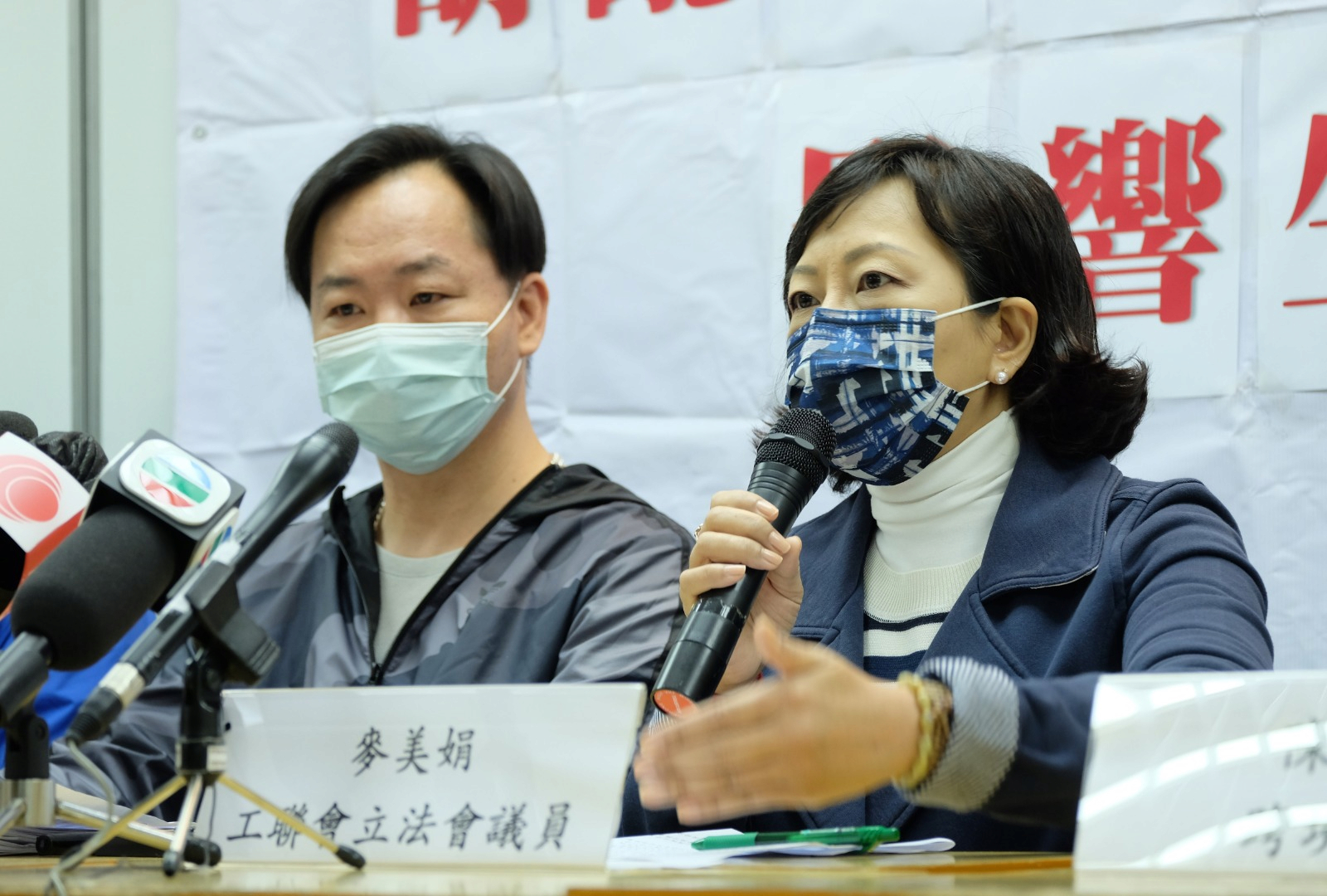 左一為貨櫃運輸業職工總會主席陳迪手,右一為協助受影響跨境司機的工聯會立法會議員麥美娟。