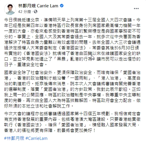林鄭昨日傍晚抵京,將列席今天開幕的十三屆全國人大四次會議。林鄭當晚於社交媒體指,全國人大及常委會過去一年,就多次從中央層面為香港解決了特區自身力量難以有效處理的問題。去年全國人大三次會議通過決定授權人大常委會制定香港國安法,並於當年6月30日頒布實施,填補了香港自回歸以來在維護國家安全的缺口,並立竿見影地遏止了黑暴亂港行為,讓市民可以走出惶恐的日子,重建安全社會。