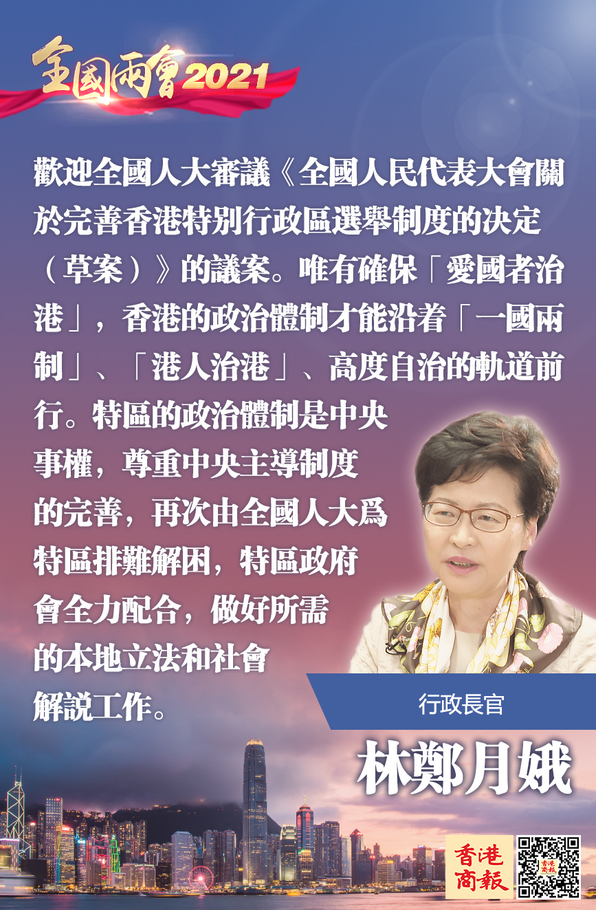 今次人大議程亦包括審議通過國家「十四五」規劃,林鄭相信一定會有支持香港發展的重要內容。她說,「只要香港能貫徹執行香港國安法,確保『愛國者治港』,積極融入國家發展大局,香港人的福祉將更有保障,前景將會更加美好!」