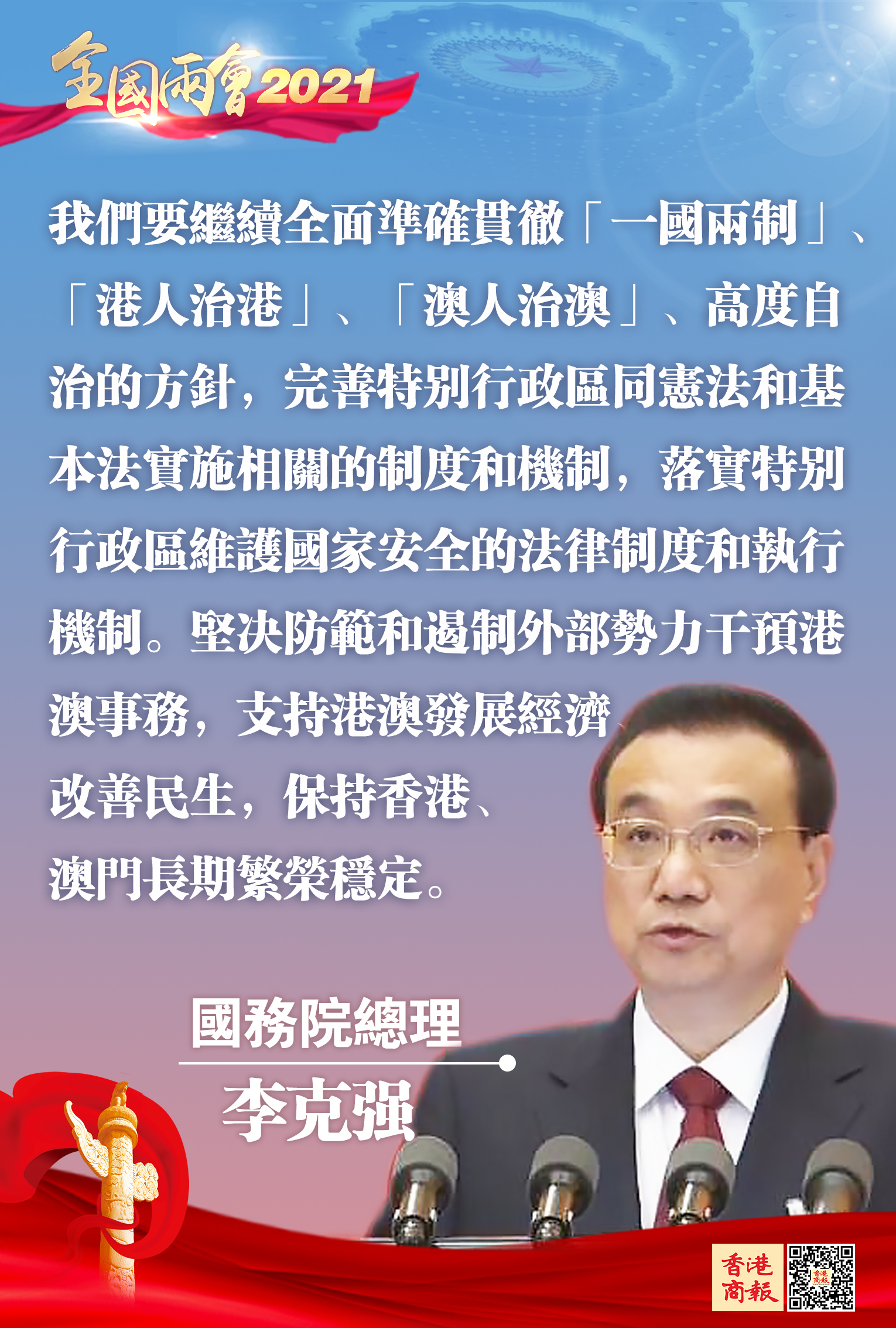 李克強在政府工作报告中谈港澳工作,强调要繼續全面準確貫徹「一國兩制」、「港人治港」、「澳人治澳」、高度自治的方針,完善特別行政區同憲法和基本法實施相關的制度和機制,落實特區維護國家安全的法律制度和執行機制。堅決防範和遏制外部勢力干預港澳事務,支持港澳發展經濟、改善民生,保持香港、澳門長期繁榮穩定。