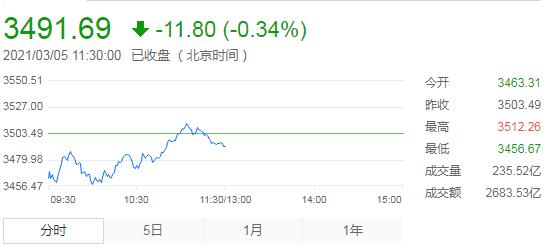 截止午間收盤,滬指跌0.34%,報2491.69點,深成指跌0.11%,報14399.51點,創業板指漲0.55%,報2867.48點。滬深兩市成交額5709.7億元;北上資金實際淨流出3.43億元。兩市60股漲停,7股跌停(含ST)。