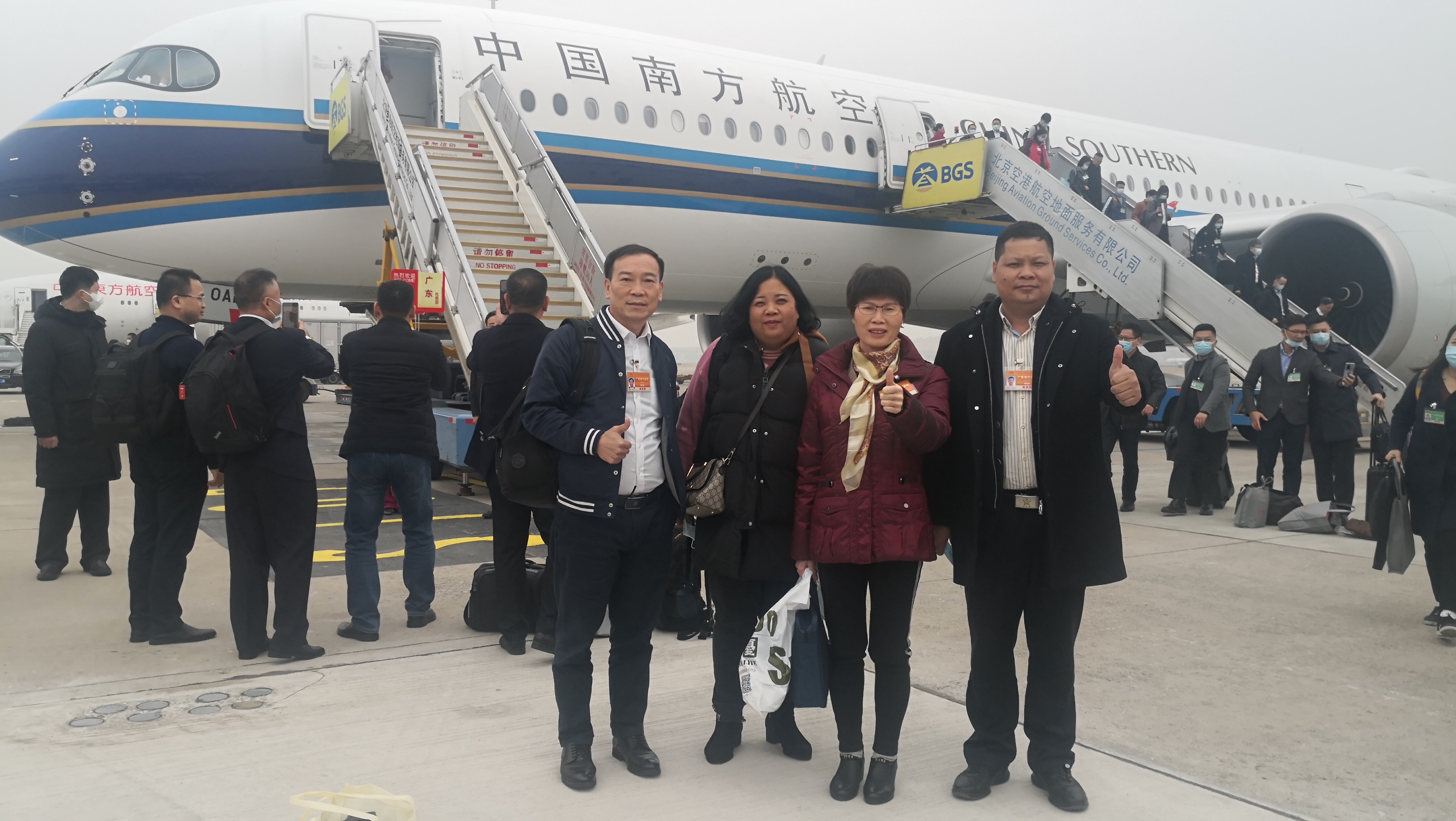 來自廣東江門的4位全國人大代表黃達昌、馮玉寶、吳玉蓮、溫艷嫦抵京在機場合影