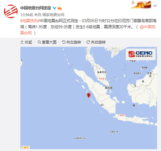中國地震台網正式測定:03月05日15時32分在印尼蘇門答臘島南部海域(南緯1.85度,東經99.05度)發生5.6級地震,震源深度20千米。